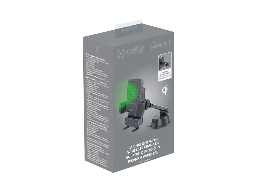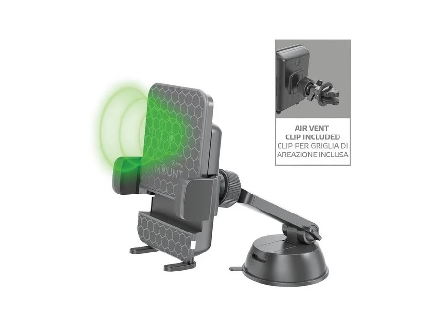 De Celly Mount Charge is een universele autohouder voor smartphones die zowel op het dashboard als op het ventilatierooster kan worden geplaatst. De mount beschikt over de mogelijkheid om het toestel draadloos op te laden (5W). U kunt deze functie gebruiken met alle maten smartphones dankzij het aanpasbare oplaadpunt. De release knop opent automatisch de armen om uw smartphone gemakkelijk te plaatsen. De rubberen armen en afsluitbare pennen zorgen voor de beste stabiliteit tijdens de reis. Compatibel met alle smartphones tot 6,5 inch.