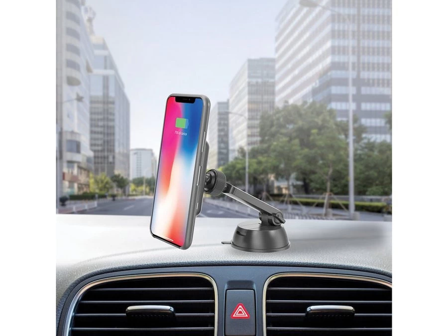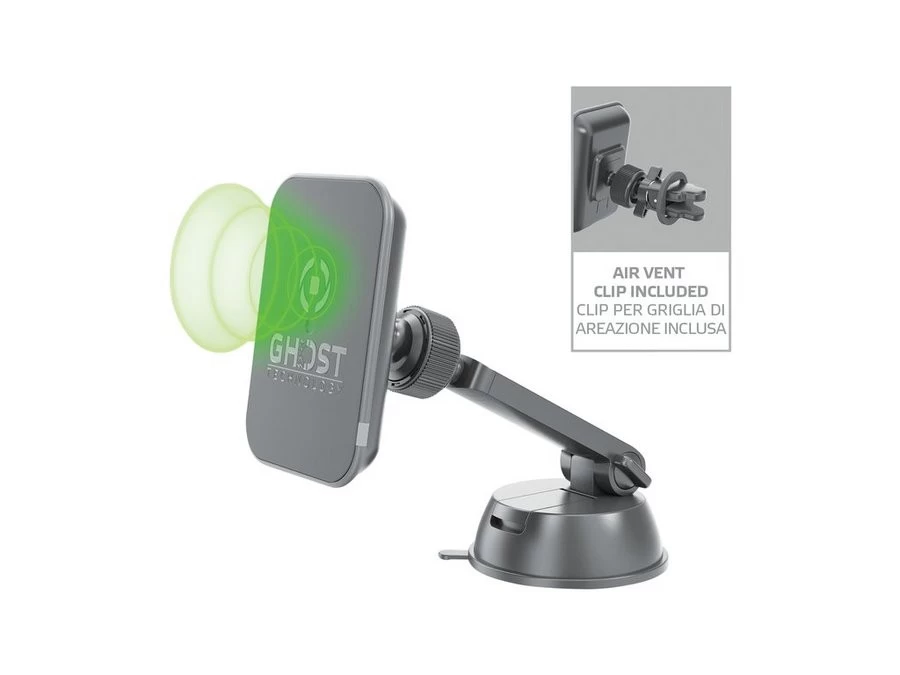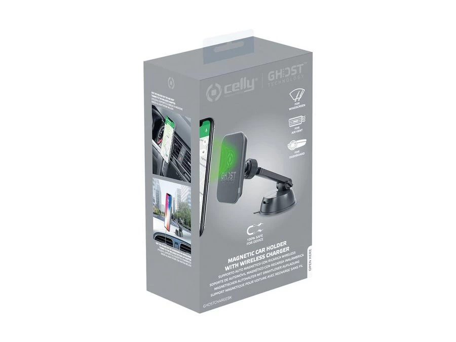 De Celly Ghost Charge is de universele smartphone-autohouder met verwisselbare voet voor de ventilatie of het dashboard. Draadloze lader maakt het mogelijk om apparaten op te laden met de draadloze laderfunctie (5W). De speciale metalen plaat zorgt voor de kracht van de lader dankzij de metalen onderdelen alleen op de hoeken. Om uw apparaat optimaal op te laden, dient u de metalen plaat te koppelen aan de houder. De rubberen bescherming van de houder zorgt voor de beste stabiliteit van uw apparaat. 360° draaibare houder maakt het mogelijk om de hoek van de smartphone naar wens aan te passen. In de verpakking zijn twee metalen kleefplaten inbegrepen om aan te brengen op elk glad vlak oppervlak, zoals de achterkant van de behuizing, smartphones, GPS-navigatie, MP3-spelers.