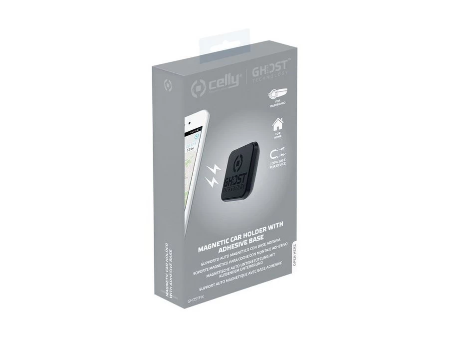 De Celly Ghost Fix is de universele zelfklevende houder met magnetisch bevestigingssysteem. Eenvoudig aan te brengen op elk vlak en glad oppervlak dankzij de extra sterke kleefkracht. Gebruik Ghost Fix in uw auto, huis of kantoor en houd uw apparaten altijd binnen handbereik! Inclusief in de verpakking twee metalen plakplaatjes om aan te brengen op elk glad vlak oppervlak, zoals achterkant van de behuizing, smartphone, GPS-navigatie of MP3-speler.
