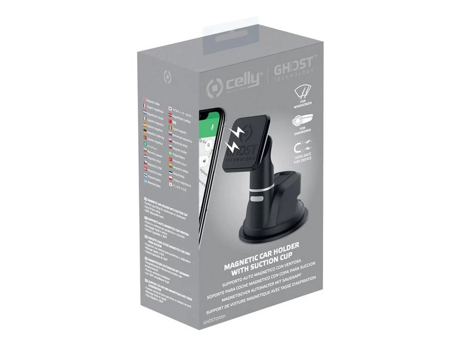 De Celly Ghostdash is een universele houder met sterke zuignap voor bevestiging aan het raam, of op een vlak en glad gedeelte van het dashboard. Het magnetisch bevestigingssysteem is geschikt voor smartphone, navigatiesysteem of MP3 speler. De meegeleverde metalen plaat wordt op een gladde vlakke ondergrond van het toestel of op de beschermhoes geplakt. Hierdoor klemt het toestel makkelijk aan de magnetische houder. De magnetische bevestiging heeft geen invloed op de werking van uw elektronische toestel. De houder is kantelbaar en het toestel kan horizontaal of verticaal geplaatst worden. De rubberen beschermlaag aan de houder voorkomt beschadigingen. De Ghostdash wordt geleverd met twee metalen bevestigingsplaten zodat meerdere toestellen op de Ghost gebruikt kunnen worden.