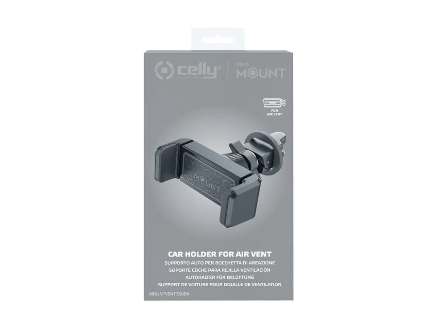 De Celly Air Vent 360 Holder is een smartphone autohouder die met een clip kan worden bevestigd aan het ventilatierooster. De One-touch functie maakt het mogelijke om de smartphone vast te zetten met slecht één beweging. Rubberen armen zorgen voor de beste stabiliteit tijdens het autorijden en de 360° draaibare bevestiging maakt het mogelijk om het toestel in landscape of portrait mode te gebruiken. De houder is geschikt voor alle smartphones tot 6.5 inch.